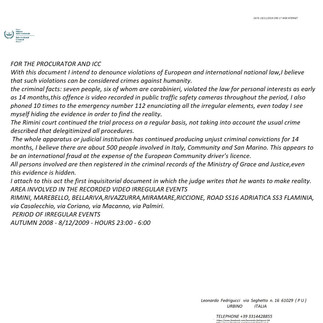 #omissioni - #di - #telecomunicazioni - #emergenza - #tecnologia - #video - #registrazioni - #sicurezza - #da - #parte - #dei - #Carabinieri - #Tribunale - #Criminal - #Quirinale - #Repubblica - #Italiana /// #denunce - #Corte - #Giustizia - #Unione - #Europea - #Commissione - #Parlamento - #Consiglio - #europa - #European - #Court - #Human - #Right - #International - #servizio - #posto - #blocco - #stazione - #mobile - #viale - #Principe - #Piemonte - #Fogliano - #Marina - #Riccione - #Miramare - #piantone - #limitrofa - #caserma - #Oliveti - #riviera - #generale - #dalla - #chiesa - #Romagnola - #Ezio - #Bevilacqua - #telefoni - #cellulari - #mobili - #privati - #servizio - #veicolo - #dotato - #sistema - #satellitare - #videocamera - #infrarossi - #telefono - #cellulare - #servizi - #banda - #pronti - #Taxi - #Italiani - #Presidente - #Ministero - #Ministro - #Procura - #Tribunale - #Rimini - #Saludecio - #Meleto - #ECHR - #Strasburgo - #Bruxelles - #Lussemburgo - #Aia - #CGUE - #CJUE - #CIJ - #Eucouncil - #ICC - #CEDU - #ECCHR - #MAFIA - #CoESPU - #UNHRC - #CHR - #COE - #Interpol - #HQ - #Europol - #Polizia - #Polizei - #Policia - #Politie - #Politiy - #Stato - #Stradale - #Ferroviaria - #Penitenziaria - #FFAA - #Aeronautica - #Militare - #Camera - #del - #lavoro - #Giudice - #Deputati - #Montecitorio - #Palazzo - #Chigi - #Roma - #Fiumicino - #INCA - #CGIL - #procedura - #falsate - #giudiziarie - #faide - #Istituzionali - #IVA - #IRAP - #IRPEF - #TARI - #bollo - #Assicurazioni - #garante - #garanzie - #garantito - #MISE - #MEF - #agenzia - #entrate - #frodi - #realtà - #codice - #civile - #Ciampino - #Raffaello - #monopoli - #norma - #Monopolio - #dogane - #Costituzionale - #valori